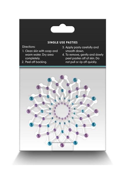 Pretty Pasties are intended for 1 time use. Package contains 1 pair. Self adhesive. Made with acryllic stones. Phtalate free. Clear packaging allows customer to view front and back of product. Instructions for use: clean skin with soap and warm water. Dry area completely. Peel off backing. Apply pastie carefully and smooth down. To remove, gently and slowly peel pasties off of skin. Do not pull or rip off quickly.